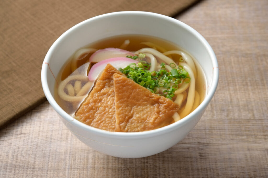 甘辛く煮付けた油揚げを、温かいかけうどんに乗せる王道の食べ方。じゅわっと出汁が染み出す油揚げは、まさに至福の味わいです。電子レンジでつくれる簡単レシピをご紹介しますので、ぜひお家で作ってみてください。