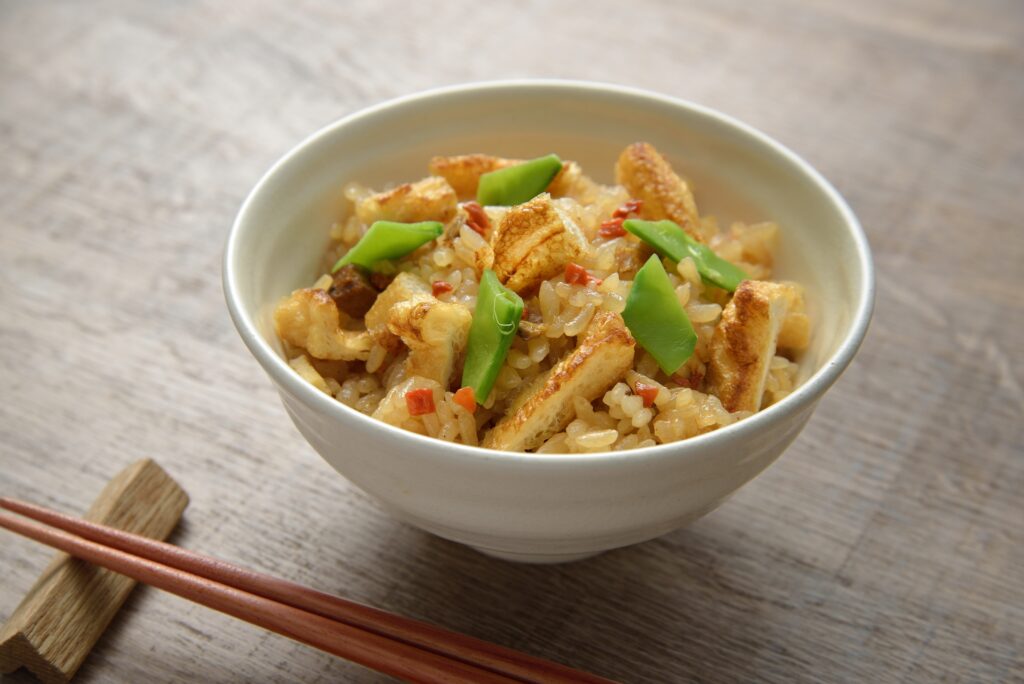 炊飯器に米と具材と調味料をセットする際に、細切りにした油揚げを加えます。油揚げが調味料と他の具材の旨味を吸い込み、お米一粒一粒に深い味わいとコクを与えます。炊き込みご飯の素を使う時もぜひ入れてみてください。