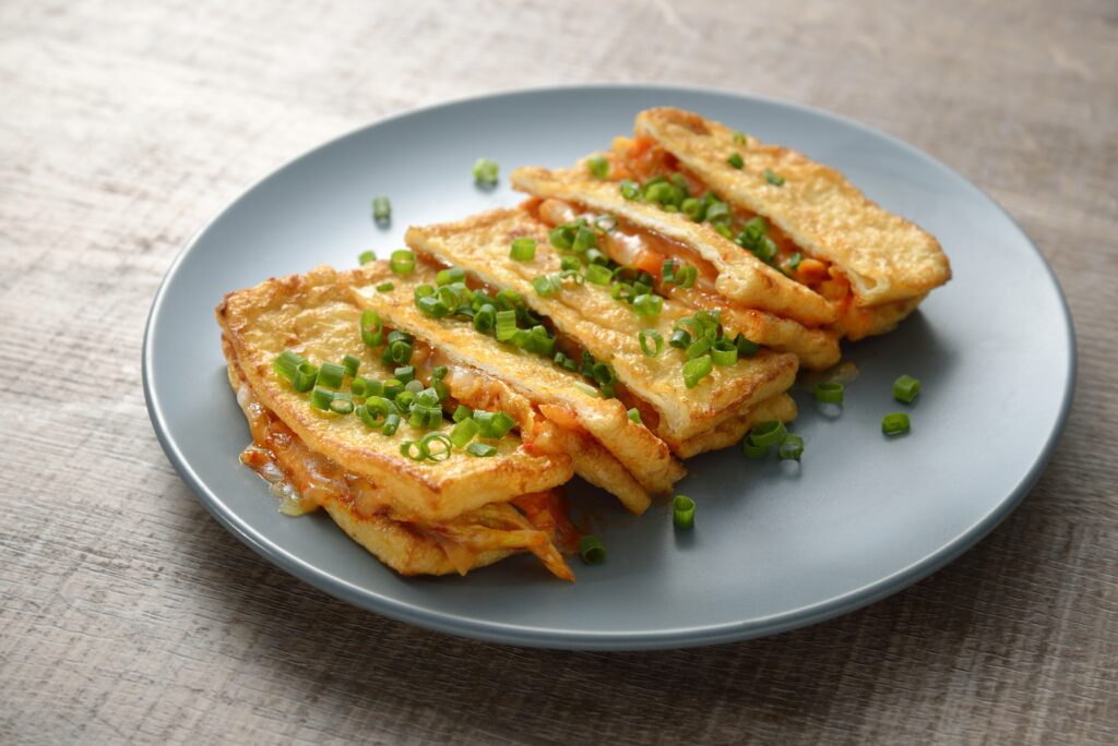 熱でとろけたチーズとキムチの発酵食品同士の旨味が絡み合い、ジャンキーでやみつきになる美味しさです。油揚げを2枚使えばボリュームも大満足です。仕上げにごま油をたらしたら韓国風の味わいに。