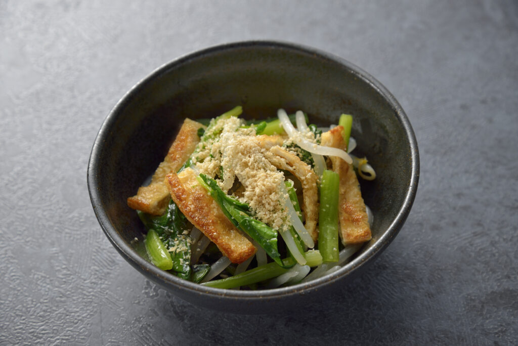 茹でた季節の野菜と細切り油揚げを、ごま油、塩、鶏がらスープの素などで和える中華・韓国風のスピードアレンジです。和風顆粒だしでつくれば簡単お浸しにもなりますね。油揚げを事前に焼いて水分を飛ばすことで、旨味を吸収してさらにおいしく仕上がります。どんな野菜とも相性抜群、もやし、ほうれん草、人参など、冷蔵庫にあるもので手軽にもう一品作れます。仕上げにすりごまをかけることで風味もアップ。