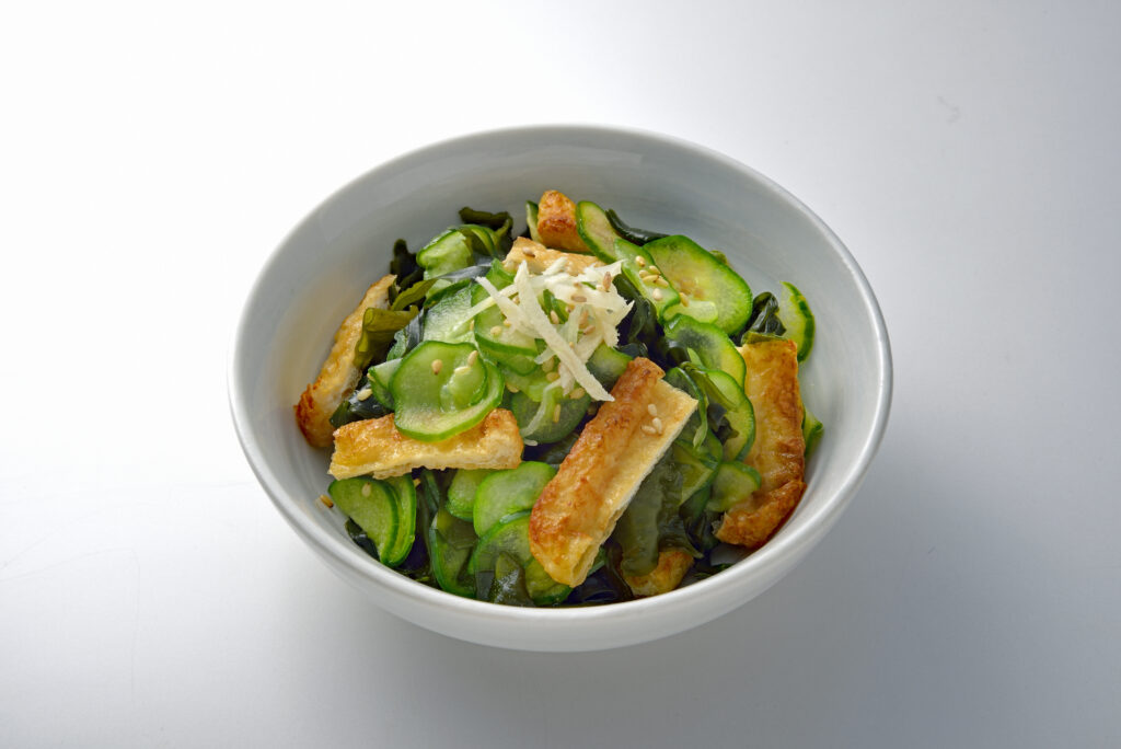 軽く焼いた油揚げを細切りにして、きゅうりやわかめなどと合わせ、甘酢や三杯酢などで和えるアレンジ。油揚げのコクが酢の物全体の旨味とボリュームをアップさせ、物足りなさを感じさせません。さっぱりとしながらもコクのある、副菜にぴったりの一品です。