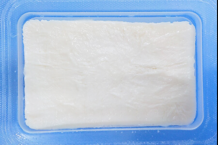 豆腐は凍結すると、外観もシワシワになり、茶色っぽく変色し、スが入ったようなスポンジ状又は湯葉のように層になり、水分が沢山出て豆腐が小さくなってしまいます。(下写真参照)