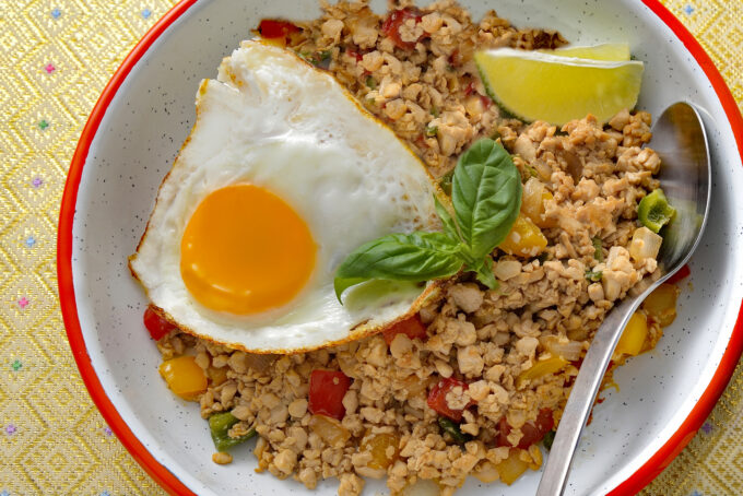 タイ料理のガパオをアレンジ!ご飯の代わりに豆腐を使ったヘルシーで満足感たっぷりのメニューです!ナンプラーとバジルの香りが広がり彩り野菜と合わせてさっぱり楽しめます。