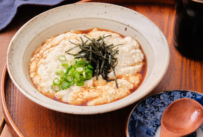 豆腐と長芋を合わせてレンジで加熱するだけで、ふんわり、もっちりとした食感に仕上がります。豆腐と長芋はいずれも消化が良く、胃腸に負担をかけにくい組み合わせ。遅めの夕食や、食欲がない時にもおすすめの優しい一品です。