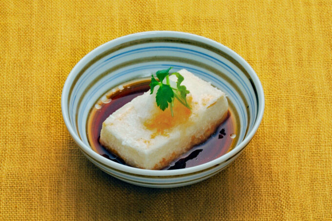 Cut the tofu into two pieces. Pat dry, coat lightly with potato starch, and shake off any excess.