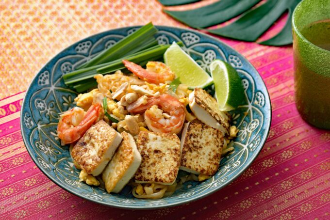 Add the noodles, tofu, bean sprouts, and chives, and toss with the sauce.