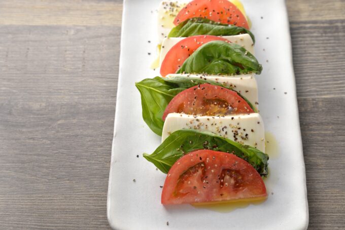 Arrange the tofu and tomato on a plate, drizzle with olive oil, and season with salt and black pepper.